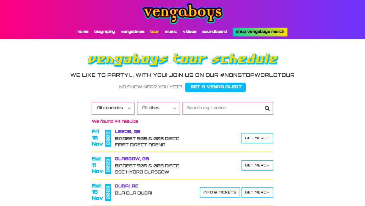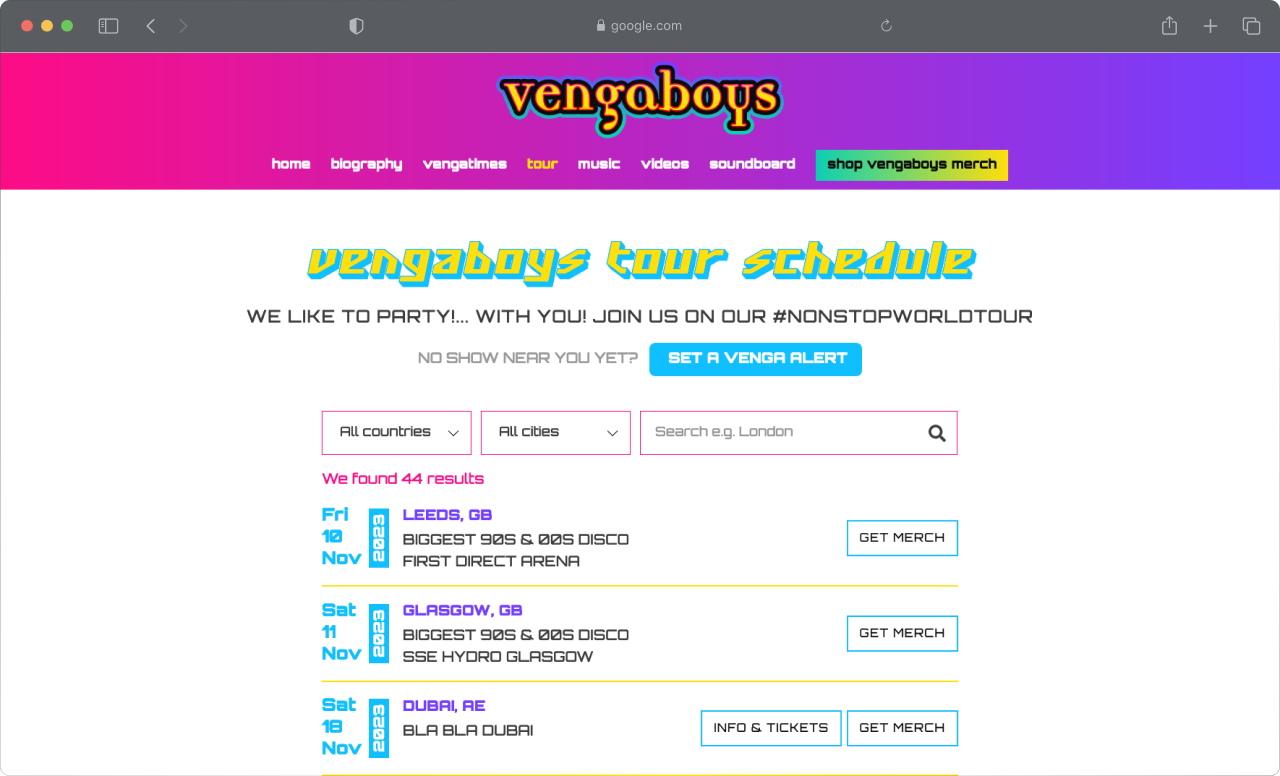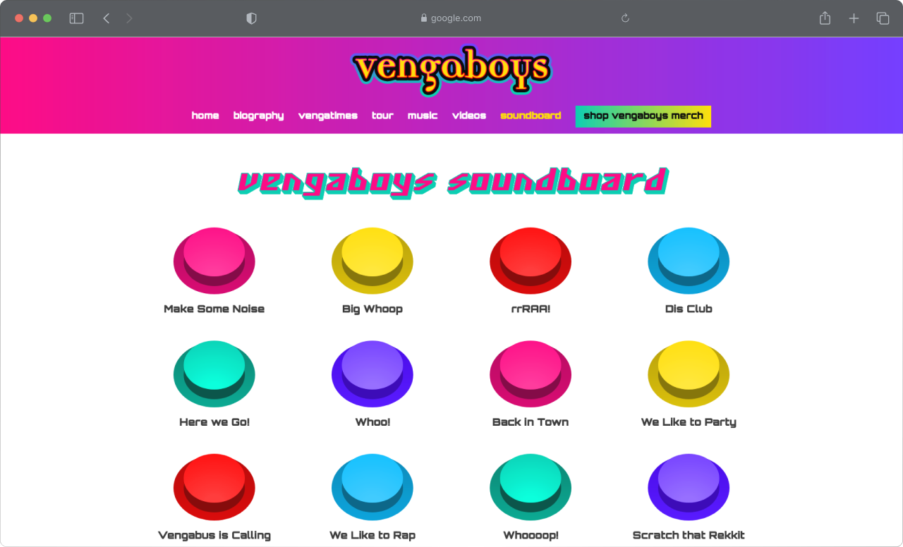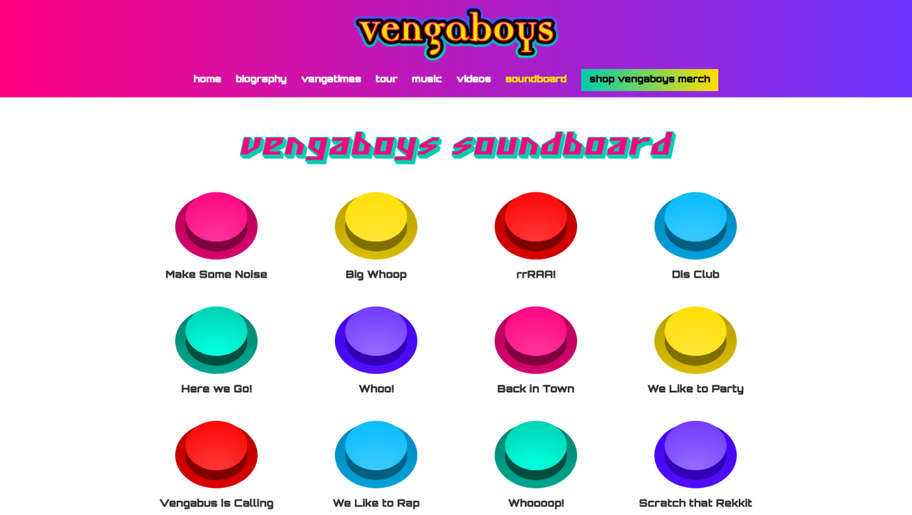 Er zijn nieuwe pagina's opgezet zoals het soundboard (probeer hem hier) waarbij je de beschikking hebt over de iconische sounds van de Vengaboys. Daarnaast worden alle van de Vengaboys optredens automatisch ingeladen om een overzicht te krijgen wanneer ze bij je in de buurt zijn.